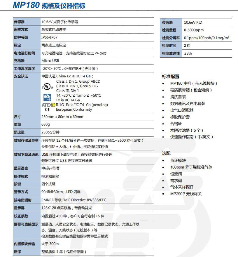 MP180 手持式檢測儀秉承了將 PID 方式應用于 VOC 快速檢測的初衷,為客戶提供便攜、準確、快速和兼具經濟性的檢測產品。MP180 實時檢測數據有圖形和數字兩種顯示模式,智能繪圖顯示氣體濃度動態,支持中英文操作界面;低功耗檢測器,一次充電可支持超過 24 小時連續檢測;數據自動存儲,數據下載方式可以通過有線或者無線方式,數據實時通訊亦可以選擇有線或者無線方式。其中無線方式可以靈活的選擇藍牙或者無線模塊, MP180 內置跌倒報警結合無線傳輸功能,將現場檢測數據實時傳輸到監測端同時保護了現場工作人員的職業衛生健康與安全。