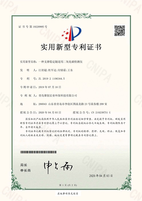聚創宏業專利儀器,二氧化碳氣體檢測儀專利證書
