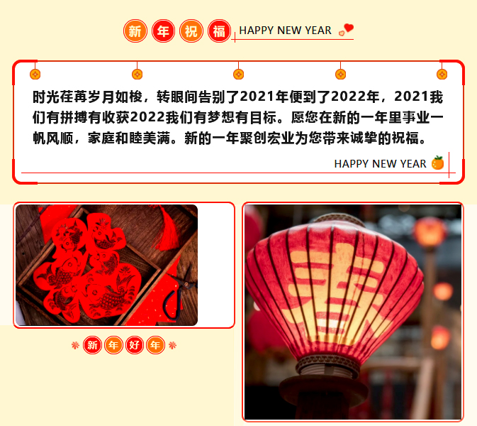 時光荏苒歲月如梭,轉(zhuǎn)眼間告別了2021年便到了2022年,2021我們有拼搏有收獲,2022我們有夢想有目標。愿您在新的一年里事業(yè)一帆風順,家庭和睦美滿。新的一年聚創(chuàng)宏業(yè)為您帶來誠摯的祝福。HAPPY NEW YEAR!