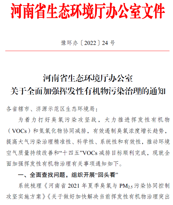 2022.4.12日,河南省生態(tài)環(huán)境廳印發(fā)了《關(guān)于全面加強(qiáng)揮發(fā)性有機(jī)物污染治理的通知》(豫環(huán)辦〔2022〕24號),為著力打好臭氧污染攻堅戰(zhàn),大力推進(jìn)揮發(fā)性有機(jī)物( VOCs)和氮氧化物協(xié)同減排,有效遏制臭氧濃度增長趨勢,提高大氣污染治理精準(zhǔn)性、科學(xué)性、系統(tǒng)性和有效性,推動環(huán)境空氣質(zhì)量持續(xù)改善和“十四五”VOCs減排目標(biāo)順利完成,要求全面加強(qiáng)VOCS治理工作。