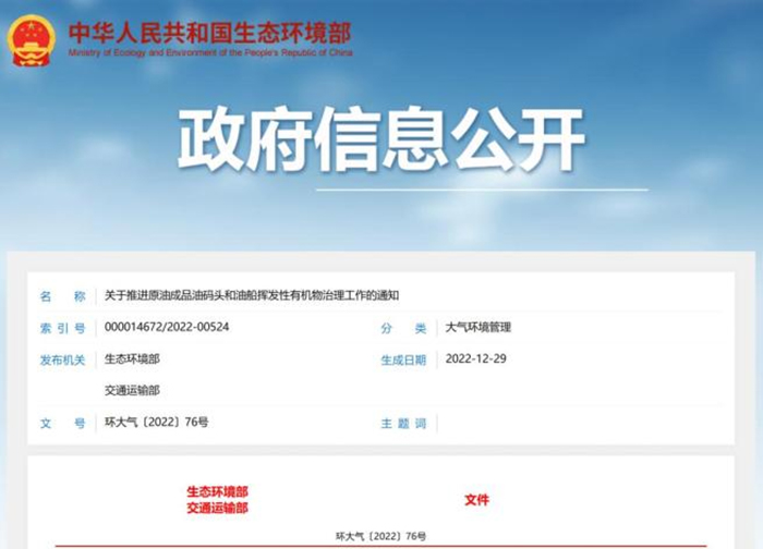 日前,生態環境部和交通運輸部聯合印發《關于推進原油成品油碼頭和油船揮發性有機物治理工作的通知》(環大氣〔202276號)。《通知》包括 6 條內容,要求各級生態環境和交通運輸主管部門做好對油碼頭、油船油氣治理的監督指導工作,并對企業在油氣回收設施建設運行方面的責任進行了明確。