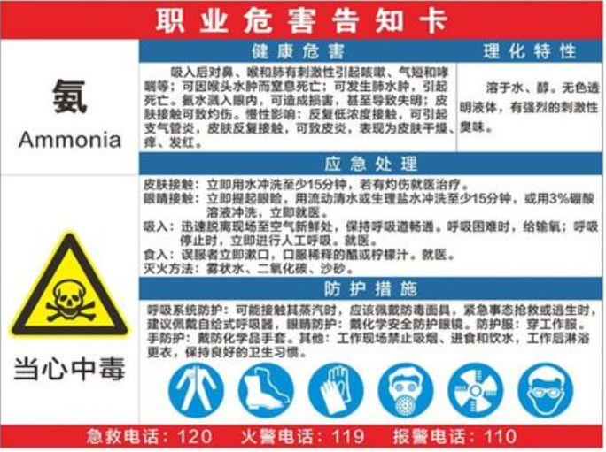 氨極易溶解于水且溶解得很快。在常溫下,1體積水大約可溶解700體積氨氣。氨在人體組織內遇水生成氨水,可以溶解組織蛋白質,與脂肪起皂化作用,高濃度氨可引起組織溶解壞死作用。氨水能破壞體內多種酶的活性,影響組織代謝;氨對中樞神經系統具有強烈刺激作用。氨進入人體后會阻礙三羧酸循環,降低細胞色素氧化酶的作用,致使腦氨增加,可產生神經毒作用。