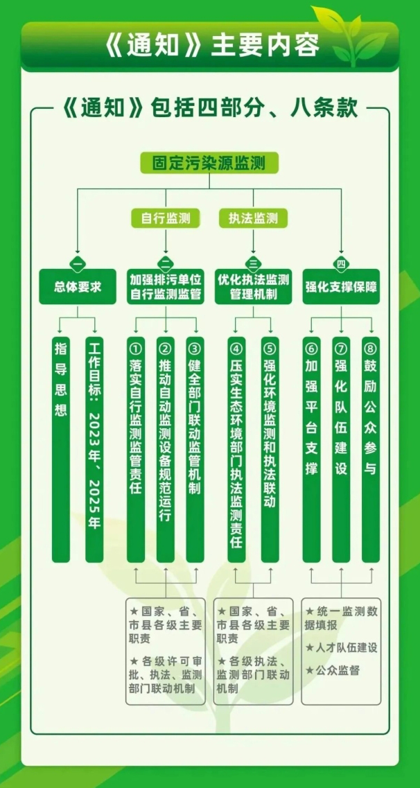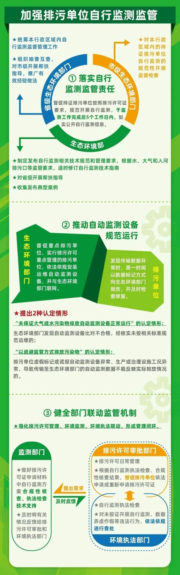 《通知》規定了各級生態環境部門的自行監測監管責任,明確了環境監測部門、排污許可審批部門、環境執法部門聯動監管機制。