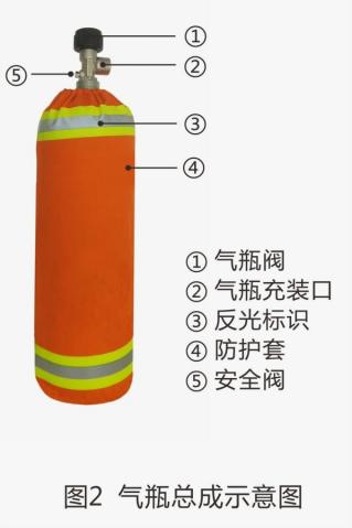 呼吸器主要由氣瓶總成、減壓器總成、全面罩總成、供氣閥總成、背托總成共五個部分組成,另配有工具包、收納袋和器材箱。