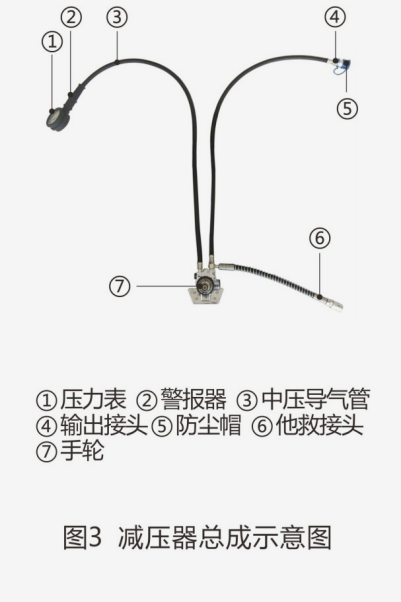 減壓器總成(圖3)是將氣瓶內高壓氣體減壓后,輸出0.8MPa左右的中壓氣體,經中壓導氣管送至供氣閥供使用人員呼吸的裝置。減壓器可在-40℃~+80℃溫度內正常工作。減壓器總成由減壓器、手輪、壓力表、警報器、中壓導氣管、輸出接頭和他救接頭組成。