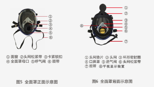 全面罩總成(圖5、圖6)是用來罩住臉部,隔絕有毒有害氣體,阻止其進入人體呼吸系統的裝置。面罩總成主要由大視野面窗、口鼻罩、呼氣閥、面罩母口、壓力平視顯示裝置和頭網組件組成。面窗內的口鼻罩可完全罩住佩戴者的口部和鼻子,能有效提高空氣的利用率。頭網組件主要采用芳綸材料、薄型網狀結構,左右兩側均配有扣環式松緊帶,柔韌性好,可以自由調節佩戴的松緊程度,增加佩戴的便捷性和舒適度。