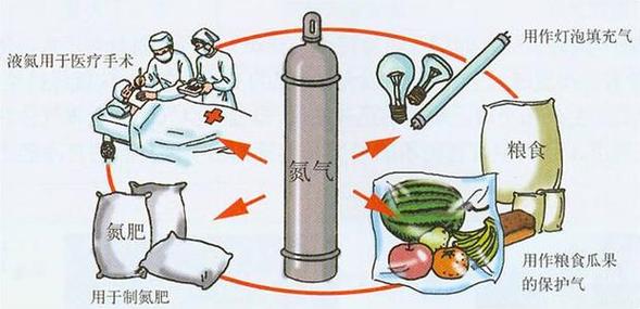 3、生產(chǎn)的氮?dú)獯蠹s10%用作制冷劑,主要包括:通常軟的或類似橡膠物質(zhì)的凝固磨碎、低溫加工橡膠、工程技術(shù)部件的冷縮配合和安裝、生物標(biāo)本,如血液的的保存、在運(yùn)輸中制冷等。